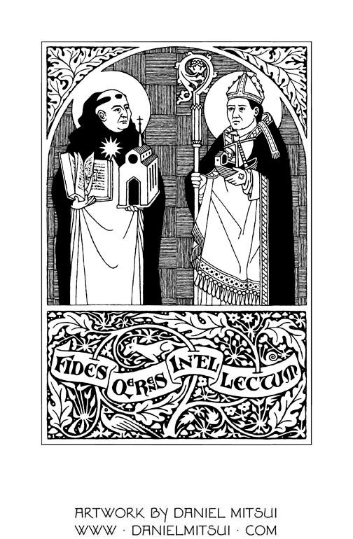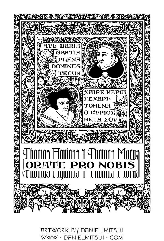 Here are two other drawings I have made of St. Thomas Aquinas, both of which pair him with another saint: Anselm of Canterbury and Thomas More, respectively.
