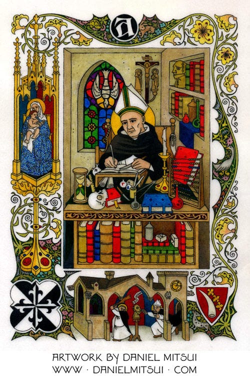 Traditionally, the feast of the great theologian and philosopher Thomas Aquinas is celebrated tomorrow, on the 7th day of March. I have drawn serveral pictures of him over the years; my favorite might be a miniature in the bas-de-page of a drawing of St. Albert (one of St. Thomas’s teachers) from 2013.